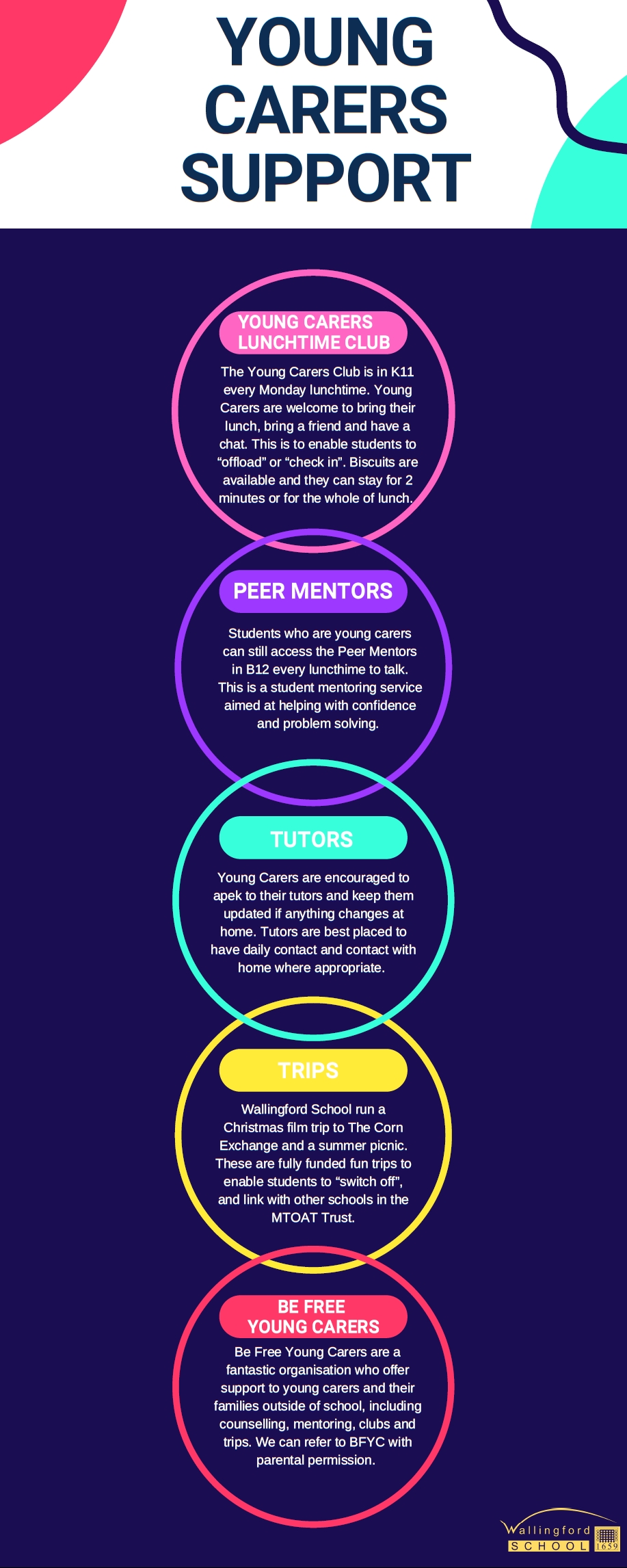 Here at Wallingford School, we have a designated team who help support our young carers which include Mrs Emmerson (Young Carers Lead) and Mr Keeling (SLT), our Heads of Year teams and our Safeguarding team.